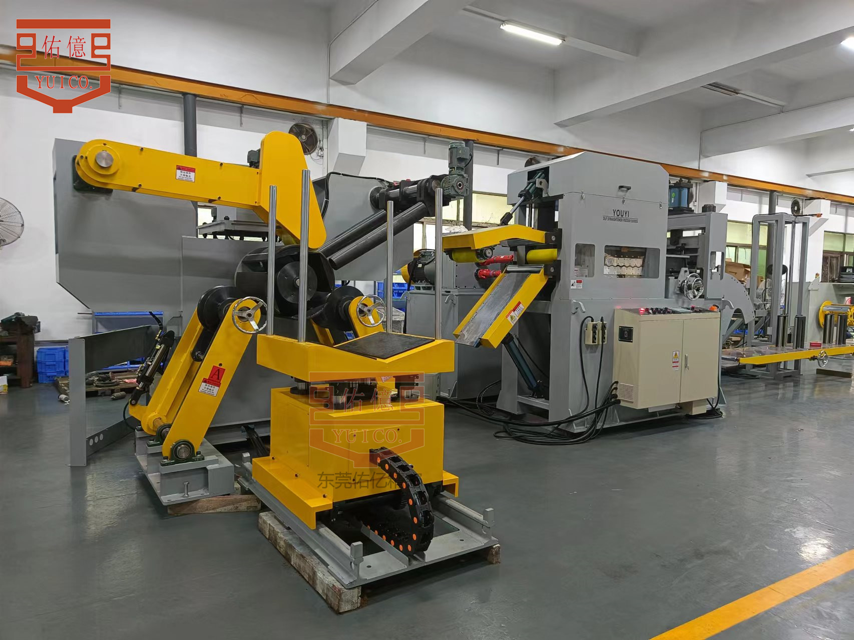 臺車的作用是作用是把材料安全平穩(wěn)地移送到開卷機主軸中心處。臺車裝備防止料卷傾倒機構(gòu),安全性更高。自動開卷機固定材料并配合矯正機把料頭慢慢導入矯正機然后自動放卷,開卷機由主體機架,擴漲料機構(gòu),壓料臂,擋料臂,圓盤式壓料臂等部份組成。