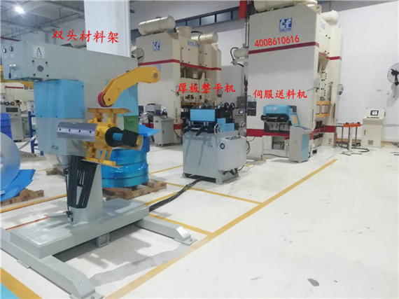 B、雙頭開卷機(jī)+伺服送料機(jī),實(shí)現(xiàn)卷料的高精度開卷送料沖壓工作,雙頭開卷機(jī)可以做到同時(shí)裝載兩卷材料,節(jié)省停機(jī)送料時(shí)間;伺服送料機(jī)可以實(shí)現(xiàn)高精度、高速度的送料,通過人機(jī)界面,可以簡單方便地設(shè)置送料步距等參數(shù),啟動(dòng)和停止輔助功能,隨時(shí)讀取相關(guān)生產(chǎn)參數(shù)。